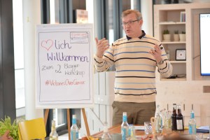Ich schlief kaum so aufgewühlt war ich. Gegen 8.45 Uhr fuhren uns unsere Fahrer in die Sturmfreie Bude in Düsseldorf welches sich im letzten Stockwerk eines Hochhauses befand. Es regnete den ganzen Tag und die Wolkenkratzer gegenüber waren wahrhaftig in graue Wolken getaucht. Dafür belohnte uns aber die beachmäßig und hell eingerichtete Location. Strohlampen, Bastteppiche, weiß gestrichene Holzmöbel und alles eingerahmt von Fenstern die bis zum Boden reichten. An einem großen langen Holztisch nahmen wir alle Platz. Der Tisch war umrahmt von Sprüchen wie „Reisen bedeutet Grenzen zu überschreiten, auch die eigenen“ – Wanda Rezat.