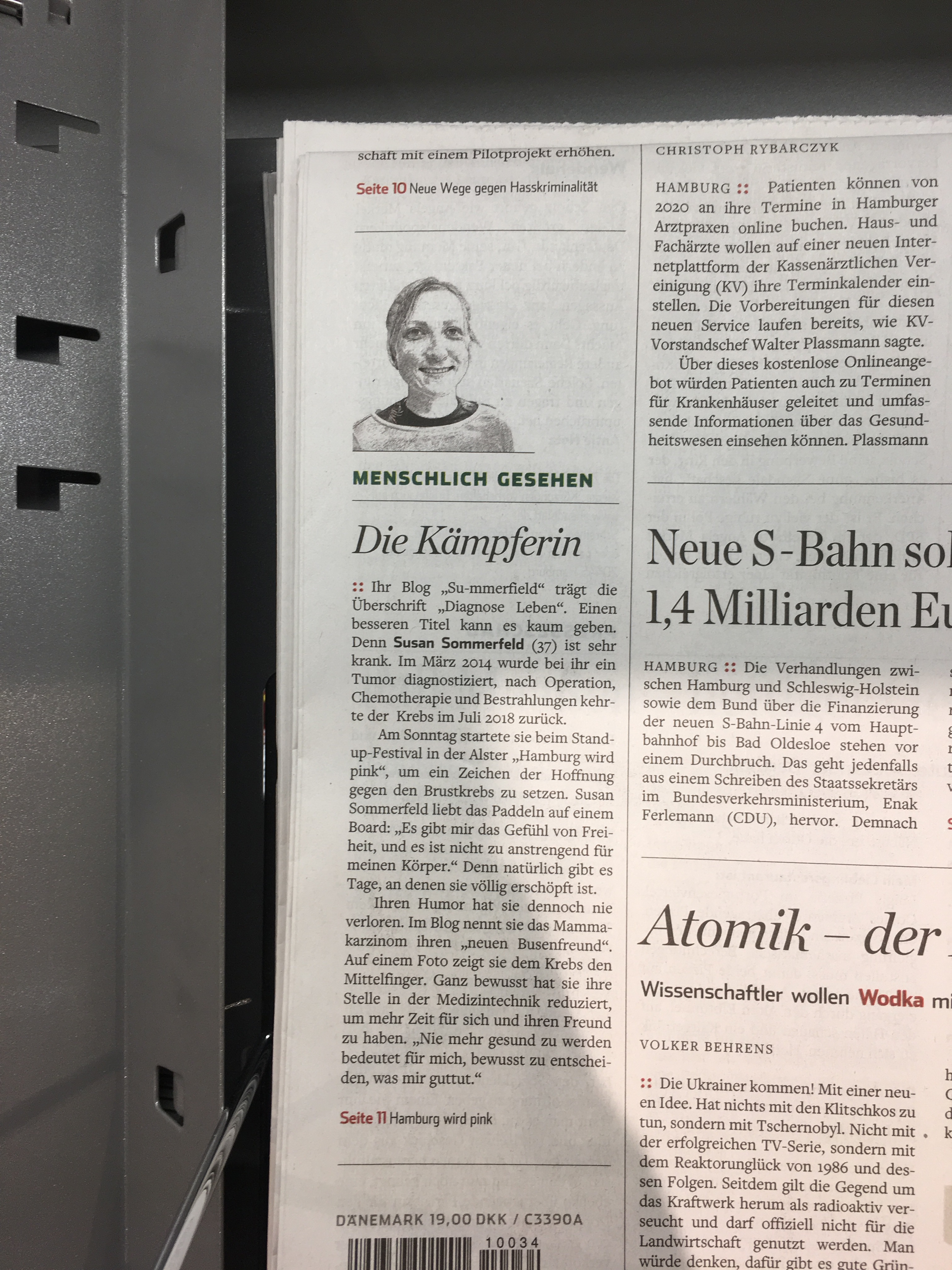 Als ich heute morgen dann zum Supermarkt fuhr und das Hamburger Abendblatt in die Hand nahm, schaute ich erst auf die Titelseite wo auf der linken unteren Seite in der Rubrik „Menschlich gesehen“ mein Foto mit einem Text stand. Ich war so überwältigt, dass ich es kaum glauben konnte. Erst später begriff ich, dass der Text auf Seite 11 weiterging. So allmählich begriff ich was da passiert war, wer ich bin und was es mit mir macht. Einerseits bin ich traurig, dass ich dieses krebskranke Mädchen bin, auf der anderen Seite macht es mich mächtig stolz zu wissen, dass ich diese starke Frau bin, die versucht ein Vorbild für andere zu sein und tagtäglich gegen den Krebs kämpft und vorerst auf der Gewinnerseite ist. Es ist nicht immer einfach, aber es ist einen Versuch wert zu überleben.