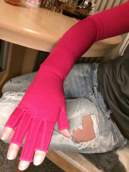 Ich suchte mir zum ersten Mal einen pinken zweiteiligen Strumpf aus. Die Farbe Fuchsia gefiel mir gut, jedoch befand sich auch schnell Dreck an den Fingerkuppen und des öfteren musste ich den Strumpf ausziehen zum Arbeiten. Es gibt den Strumpf auch mit freien Fingerkuppen für Patienten die am Laptop arbeiten. Da meine Fingerkuppen jedoch auch dick werden, wollte ich das ganze Paket haben. Bei der Arbeit trug ich den Strumpf jedoch nicht mehr so oft, da es mich störte und ich kaum Gefühl durch den Stoff auf die Tasten hatte. Der Strumpf, der am Handgelenkt zudem überlappte, engte mich an der Stelle ein. Die Stelle am Handgelenk schnitt sich ein und mein Handrücken wurde immer dicker. Auch mit der Lymphrainage wurde es nicht wirklich besser. Ich mochte den Strumpf kaum noch tragen, höchstens beim Sport.