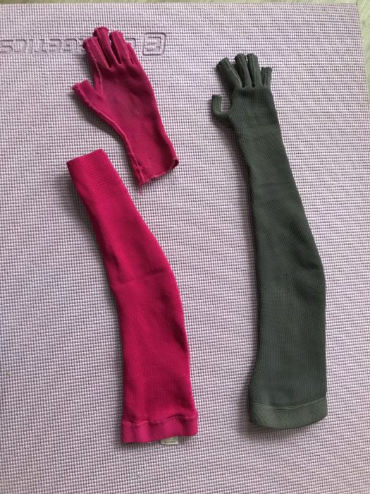 Der neue Kompressionsstrumpf ist grau und einteilig. Von den Fingerkuppen bis zur Schulter lang ist das Teil und gar nicht so einfach anzuziehen. Lange Fingernagel sollte man dabei nicht haben, da diese wirklich brechen könnten oder es gibt jemanden der einem hilft. Besonders bei Hitzewallungen muss ich warten bis diese vorüber sind. Denn Schweiß stoppt das Überziehen enorm. Den neuen Strumpf ziehe ich nur noch zum Schlafen oder zum Sport an. Dummerweise wurden die Maße nicht richtig genommen, so dass der Daumen nicht durch die Fingerkuppe passt. Also stecke ich den Daumen nicht durch die Kuppe sondern in die Hand hinein. Das passt momentan ganz gut, jedoch ziehe ich mir den Strumpf automatisch im Schlaf aus, weil es anfängt zu jucken. So ganz optimal ist dieser Kompressionsstrumpf noch nicht für mich angepasst. Mal schauen wie der nächste Strumpf wird. Irgendwann habe ich eine komplette Sammlung und kann immer wieder auf ein neues Paar zurückgreifen.