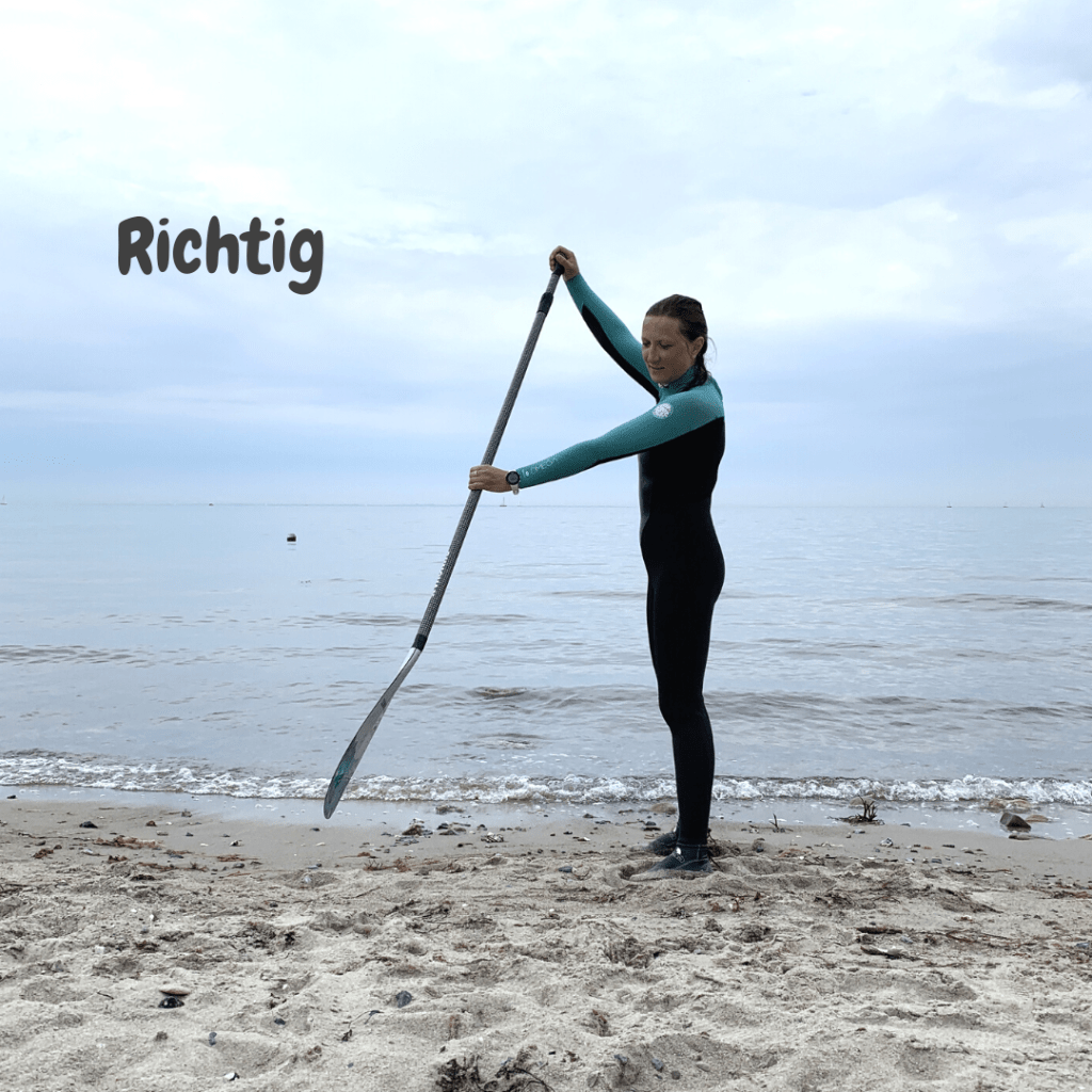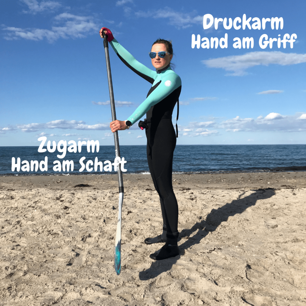 Um die richtige Position der Arme am Paddel zu finden, fassen wir das Paddel am ergonomischen Griff sowie am Schaft an. Dabei heben wir es über uns und versuchen dann die Arme so anzuwinkeln bis ein 90Grad Winkel entsteht. Sobald diese Position erreicht ist strecken wir die Arme einmal komplett durch nach oben. Es entsteht ein Dreieck, auch Kräftedreieck genannt. Die Arme bleiben während des ganzen Paddelns immer in dieser Position des Kräftedreiecks.