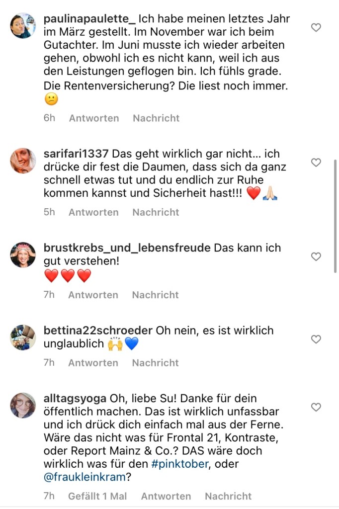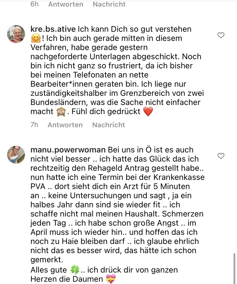 Ich bin total baff, weiß gar nicht was ich sagen soll. Der Herr fühlt sich nicht verantwortlich für mich. Ich wünsche mir nicht krank zu sein, wieder arbeiten gehen zu können, Vollzeit. Dann hätte ich diese Probleme nicht noch zusätzlich. Die Bürokratie aufgrund einer Erkrankung ist das ziemlich uncoolste was es gibt, bringt mich an manchen Tagen zum verzweifeln, weil ich nicht weiterkomme. Keiner fühlt sich zuständig, man wird von Person zu Person geschoben, vertröstet. Die Krankenversicherung will einen nicht mehr haben, der Staat ist auch nicht verantwortlich und die Rentenversicherung ist auch keine Hilfe, alles eine große Last. Habe ich nicht in Versicherungen eingezahlt um im Falle des Falles abgesichert zu sein? Die Krankenversicherung und die Rentenversicherung sehen das nicht so.