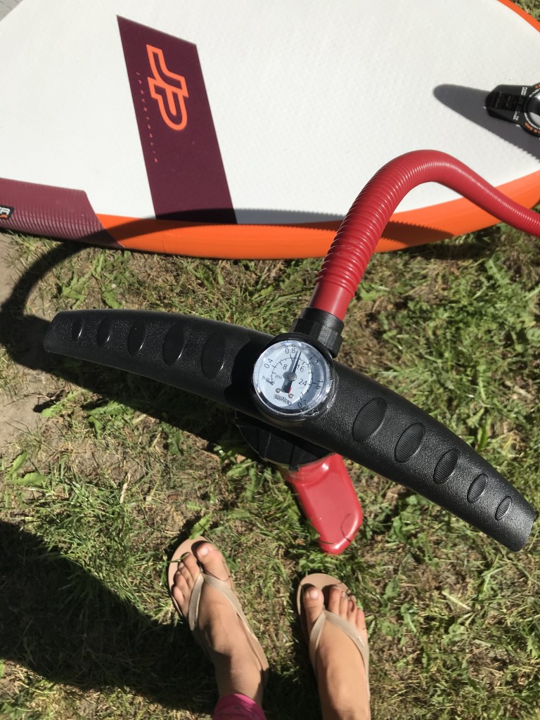 Dort wo der Schnorchel zum Aufpumpen am SUP eingesteckt wird, steht im Kreis herum wieviel PSI oder Bar das SUP haben sollte. Oft sind das 15 PSI oder 1 Bar. Wichtig ist, das SUP gut aufzupumpen, sonst kann es durchbiegen auf dem Wasser und man verliert an Geschwindigkeit und irgendwann auch an Spaß. SUP Board leben von ihrer Steifigkeit, um so ihre besten Fahreigenschaften entfalten zu können.
