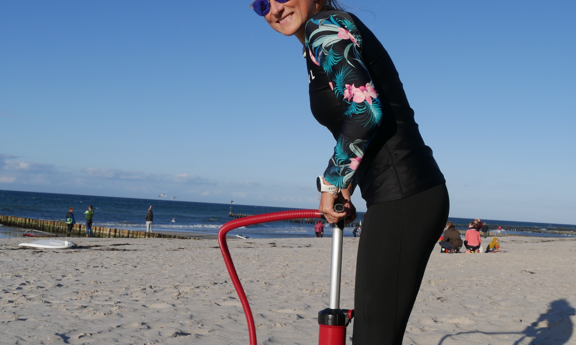 Das Aufpumpen vorab gleicht immer einem kleinen Workout , wenn man keine Akkupumpe hat. Die Akku Pumpe von STX würde ich auf jeden Fall empfehlen, auch wenn sie am Ende etwas laut ist. Das Aufpumpen geht aber sehr schnell, so dass es aushaltbar ist. Außerdem ist es möglich die Akkupumpe mit an den Strand zu nehmen und erst dort aufzupumpen, was in Sankt Peter Ording ziemlich gut ist bei solch einem langen Strand. Die Pumpe besitzt zusätzlich Beleuchtung, zwei USB-Auflademöglichkeiten und mindestens 5 Standuppaddleboards können damit aufgepumpt werden. Am Auto kann die Pumpe im Kofferraum ganz einfach wieder aufgeladen werden oder auch zuhause.