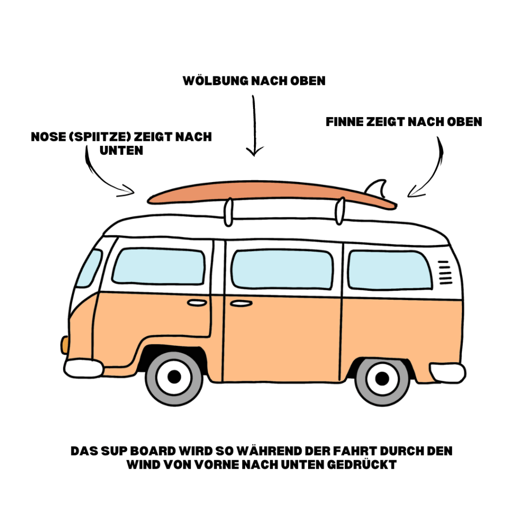 Eine Möglichkeit ist es, das Board auf dem Autodach zu verzurren. Hierfür sind Dachträger notwendig, die an das Dach des Autos angebracht werden können. Diese müssen passend zum Autofahrzeug gewählt werden. Eine Alternative sind universal einsetzbare Soft-Racks (hier gibt es auch aufblasbare), die einfach auf das Autodach gelegt und mit Spanngurten befestigt werden.
