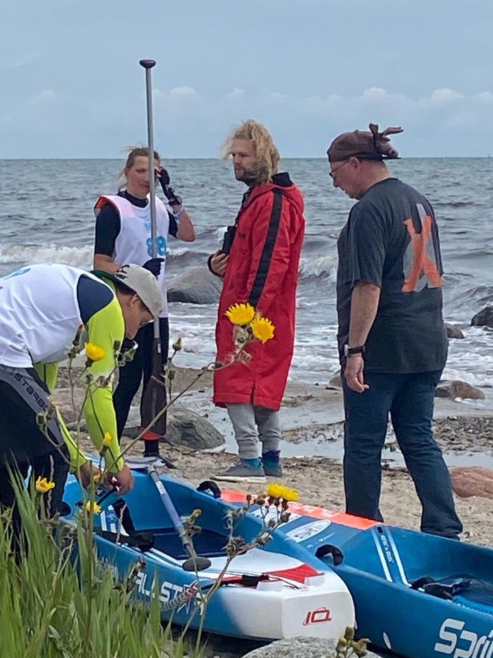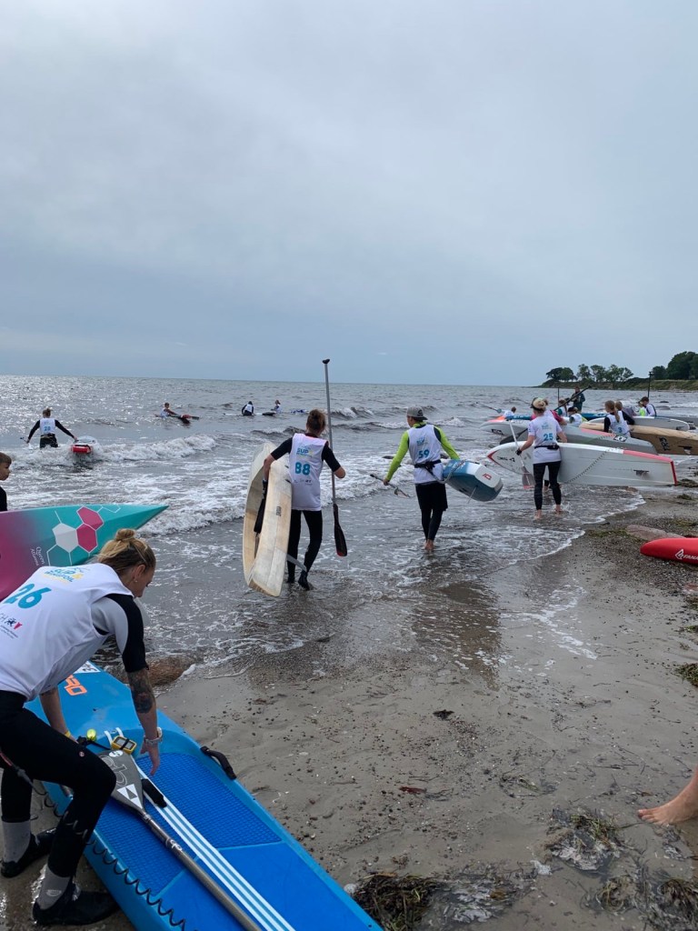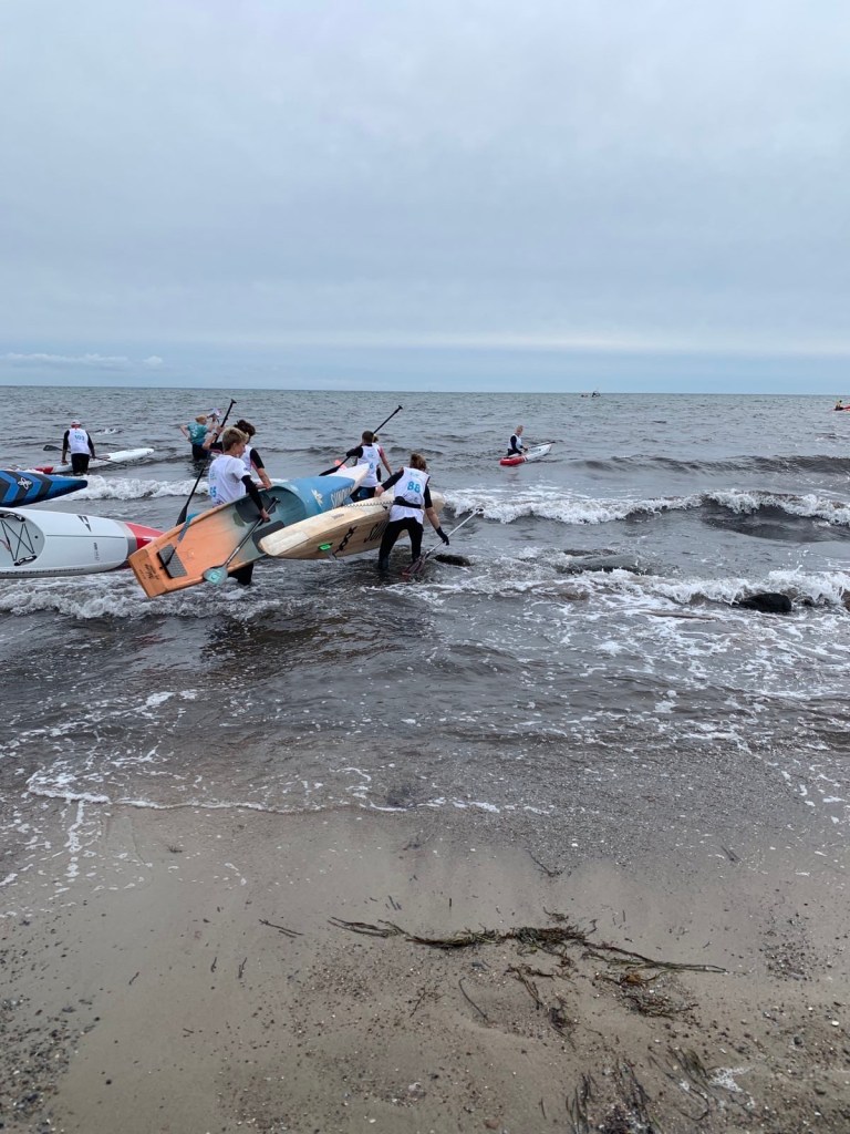 Es mussten einige zurückfahren an den Start, andere durften weiter. Der Strand war voller Steine, rutschig und groß, zackig und klein. Es war schwierig bei den Wellen aus dem Wasser zu kommen, ohne dass das SUP Board beschädigt wurde. Am Start warteten Freunde und Familie. Wir hatten vereinbart zu warten bis alle um die Ecke im Wasser waren. Da einige wieder zurück gesendet wurden, inklusive mir, hatten wir Glück und konnten wieder nach Hause fahren mit unseren Autos. Gemeinsam teilten wir uns auf die Autos auf, nachdem Tinca Tusche uns aus dem Wasser half. Sie nahm unsere Boards entgegen oder hielt uns fest an der Hand, so dass wir nicht ausrutschten.