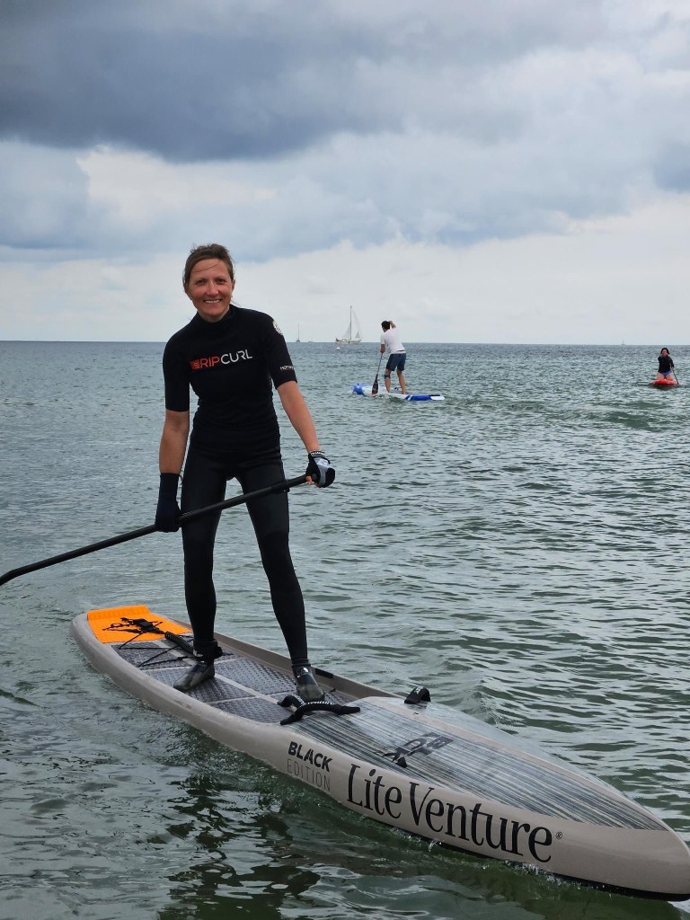 Ich hatte mir für dieses Jahr ein SUP Rennen vorgenommen, auf das ich mich den Sommer über konzentrierte. Gleichgewichtsübungen auf dem Balance Board oder dem SurfSUP auf der rauen Nordsee, Racetraining im Verein in Hamburg, auf der Ostsee mit verschiedenen Boards paddeln bei verschiedenen Bedingungen, auf dem Ergometer Fahrrad fahren, Seilhüpfen. Das alles in Maßen, so wie ich es gerade konnte.