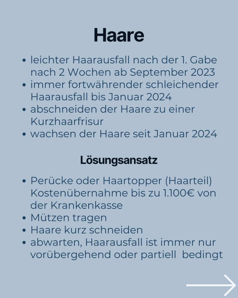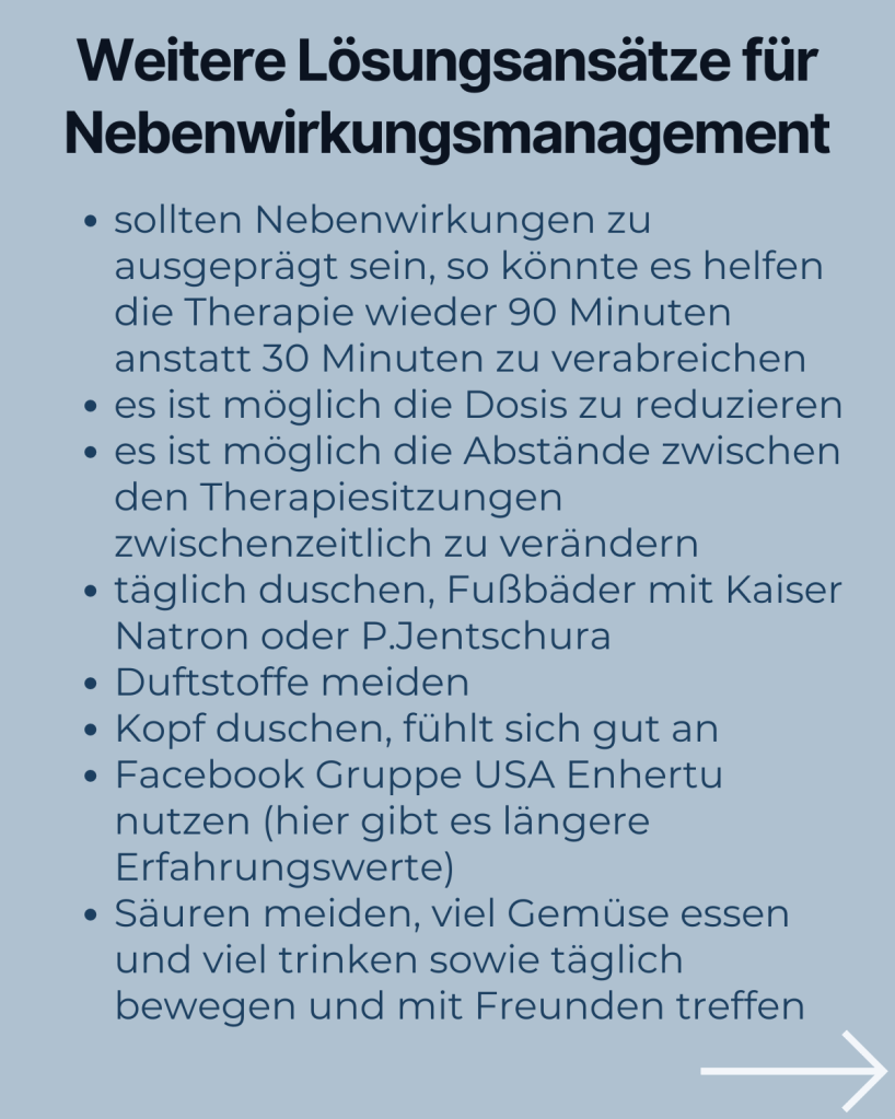 Dies sind reine Erfahrungswerte von mir und wie ich es von einigen Patienten in Gesptächen erfahren habe und auch durch die Facebook Gruppe Enhertu aus den USA.