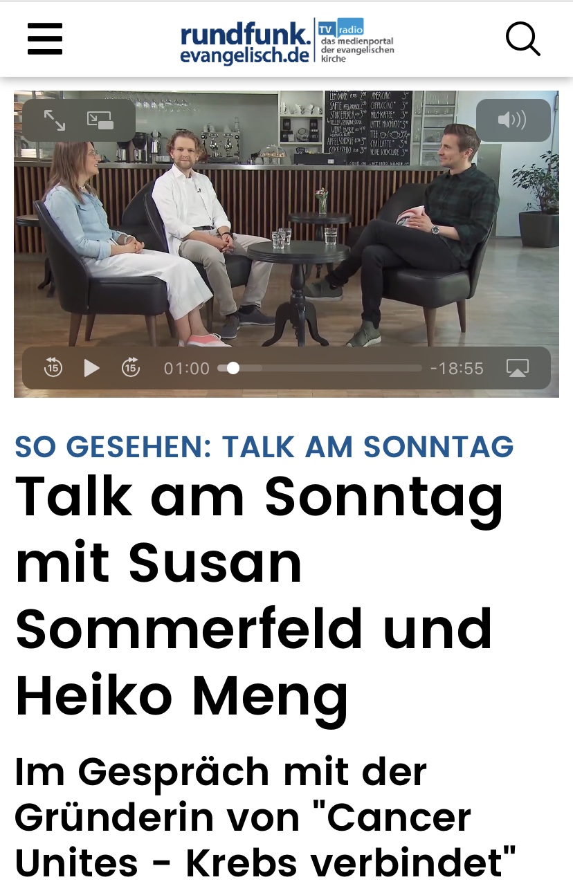 Am Sonntag ist die Palliativpatientin Susan Sommerfeld mit ihrem Freund Heiko Meng zu Gast bei der von uns im Auftrag von EKD und Sat.1 produzierten Talksendung „So gesehen – Talk am Sonntag“.