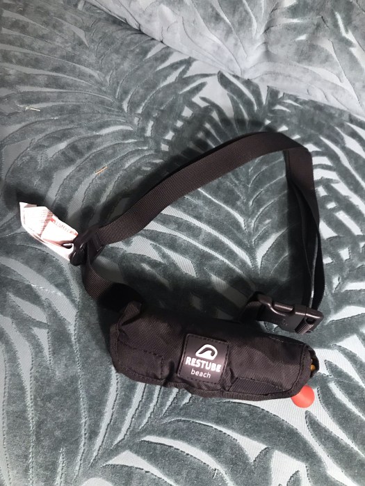 Ein Restube ist um den Bauch zu tragen. Im Notfall wird an dem roten Knopf gezogen, so dass sich das Restube aufpumpt zu einer gelben Boje auf die du dich legen kannst oder damit nach Hilfe wedeln kannst. Ein Restube ersetzt keine Schwimmweste!