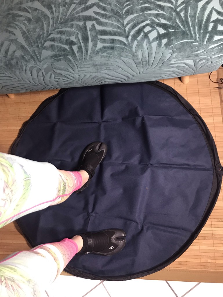 Die Umziehmatte ist aufgefaltet super zum Umziehen, so dass der Neoprenazug oder alles andere nicht dreckig werden nach oder vor dem paddeln. Die nassen Sachen können in die Umziehmatte gelegt werden. Die Matte ist wasserfest und kann mit einer Kordel zusammengezogen werden, so dass darin die nassen Badesachen transportiert werden können.