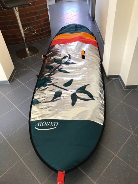 Ein Hard SUP braucht Schutz, damit es nicht zerkratzt oder beschmutzt wird. Die Boardbag (Tasche) gibt es in verschiedenen Größen und kann mit oder ohne angebauter Finne genutzt werden. Wenn die Finne noch angebaut ist, kann diese auf der Rückseite durch die Boardbag rausgucken.