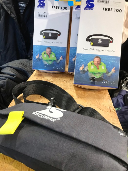 Wenn du keine normale Sicherheitsweste tragen möchtest gibt es von Secumar eine Art Bauchtasche worin sich eine Weste befindet die du im Notfall schnell überziehen kannst.
